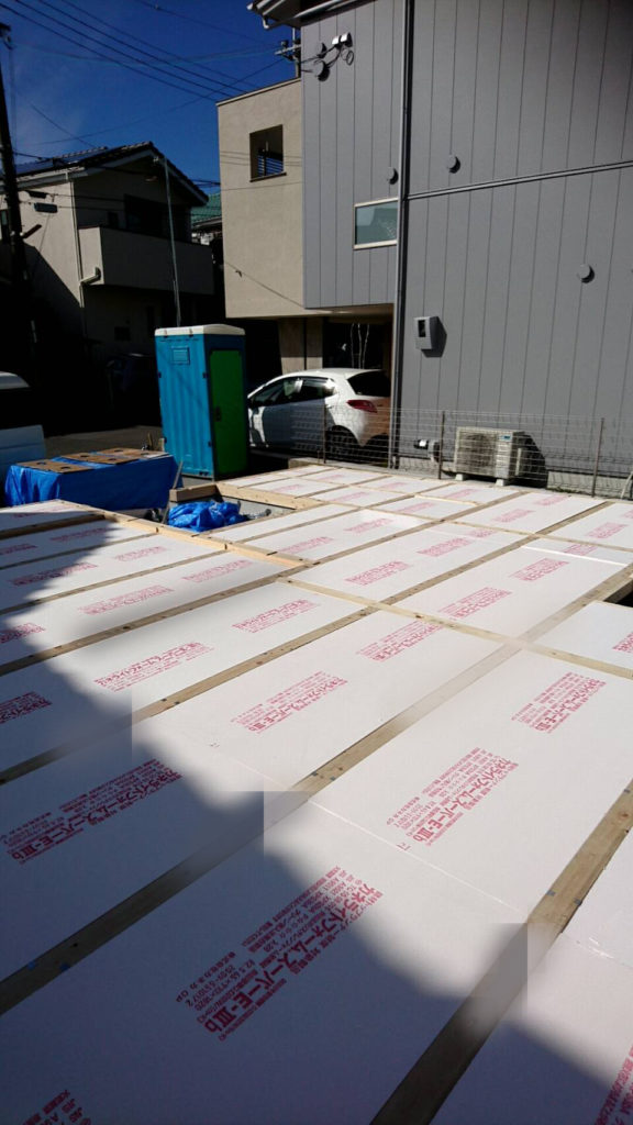床下断熱材が充填されると、床板が貼られて、