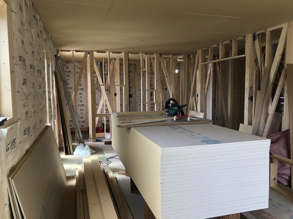 断熱材が充填されると、天井から石膏ボードが貼られていきました✨